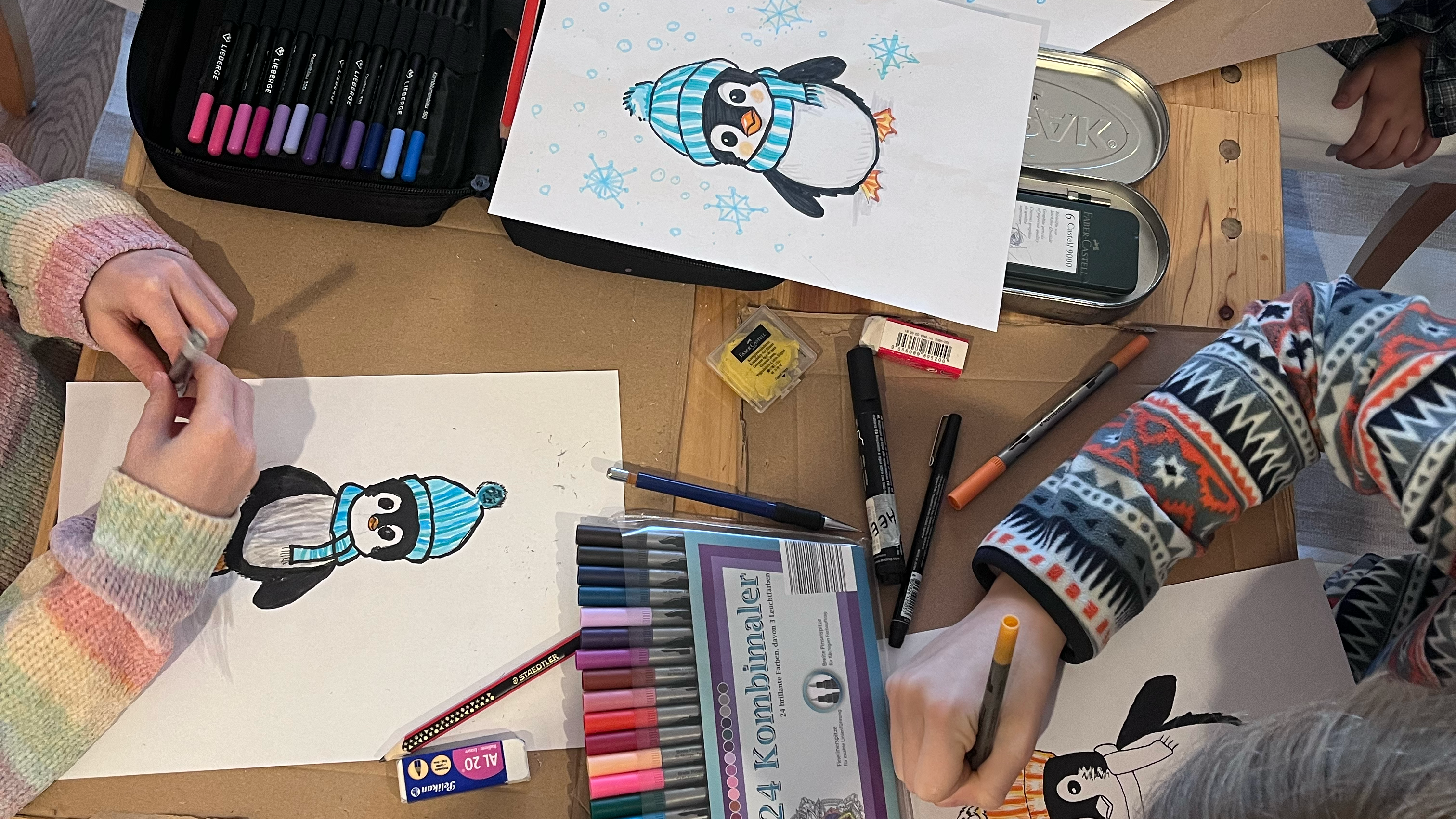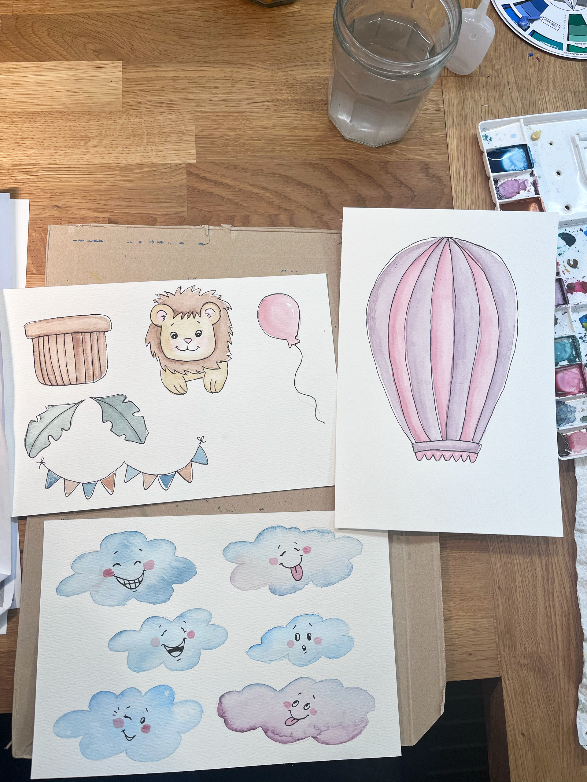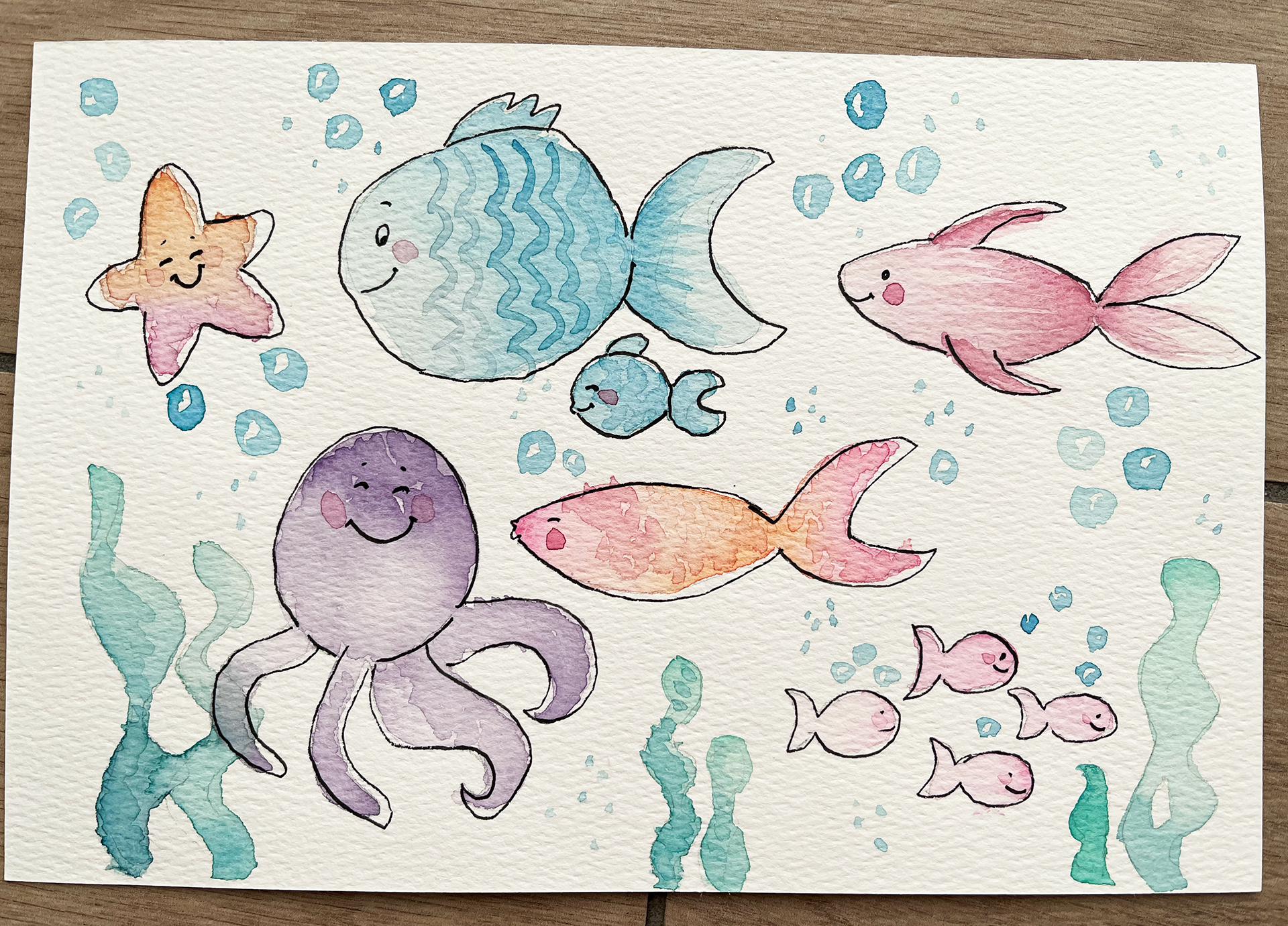 Die Aquarelltechnik wird bewusst mit anderen gestalterischen Elementen wie Filzstiften, Buntstiften, Collage und Bastelmaterialien kombiniert. So entsteht am Ende ein individuelles Kunstprojekt, das die Kreativität, Feinmotorik und Ausdrucksfähigkeit der Kinder fördert.